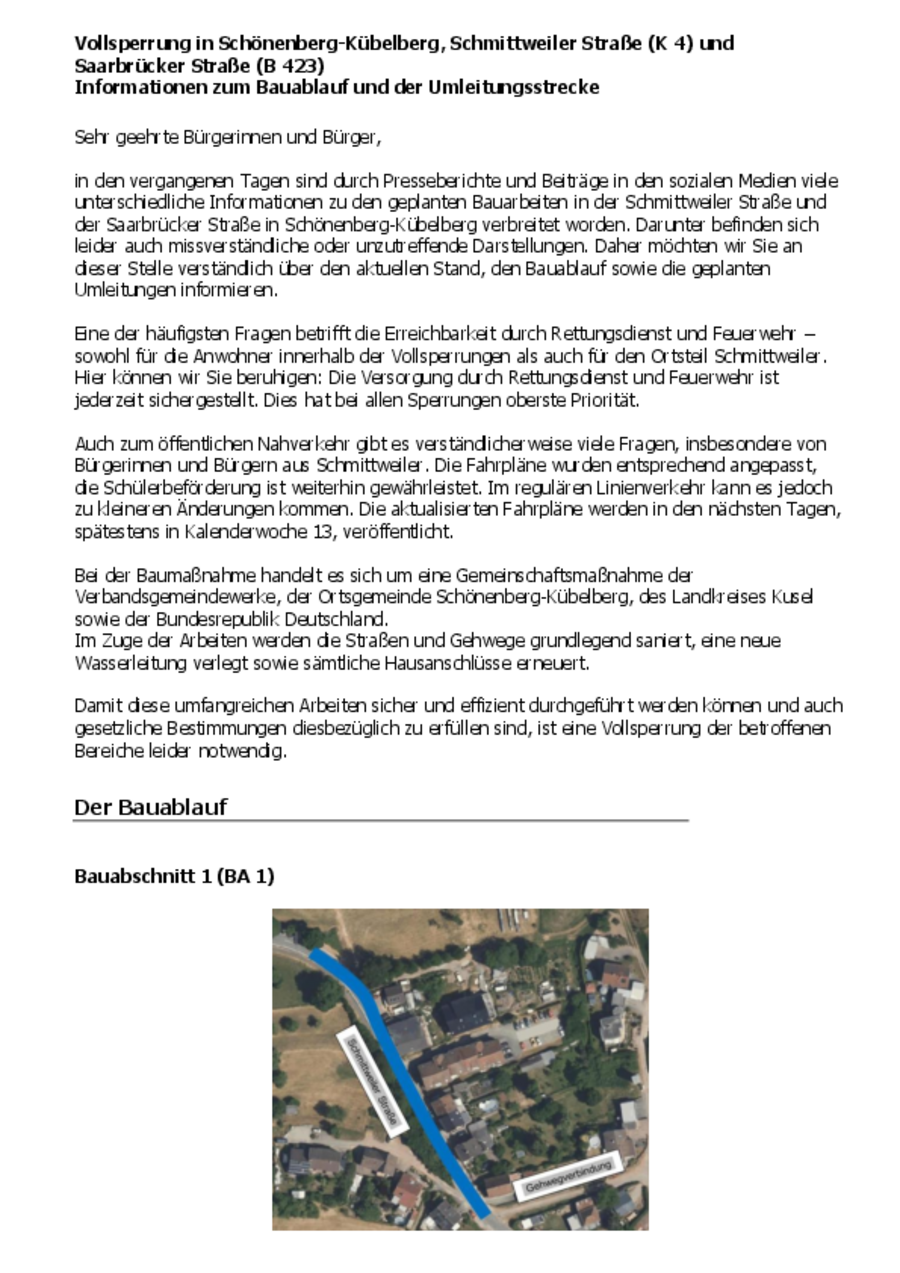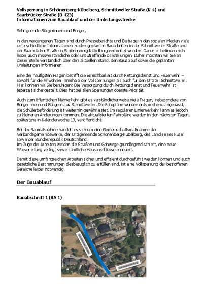Alle Informationen zu Bauablauf, Umleitungsstrecken und betroffenen Bereichen finden Sie im verlinkten PDF Dokument "Vollsperrung in Schönenberg-Kübelberg - Informationen zum Bauablauf" .